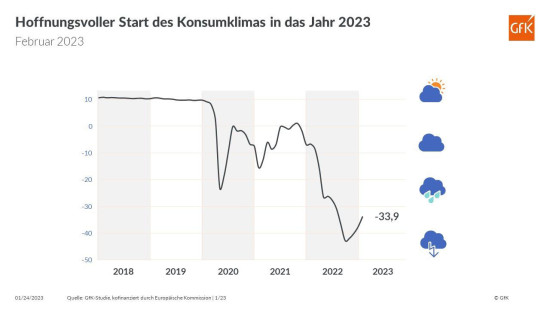 Die Verbraucherstimmung in Deutschland startet mit etwas mehr Optimismus in das Jahr 2023, so die GfK. Das Konsumklima verbessert sich zum vierten Mal in Folge. Für den erfreulichen Start sind laut den Konsumforschern in erster Linie weniger stark steigende Preise für Energie verantwortlich.