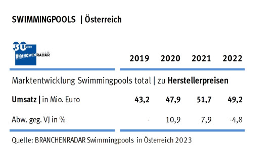 In den Corona-Jahren 2020 und 2021 erlebte der Markt für Swimmingpools einen unerwarteten Aufschwung. Mit dem Ende der Restriktionen im vergangenen Jahr flaute jedoch auch die Nachfrage ab. Laut aktuellem Branchenradar Swimmingpools in Österreich wurden im Jahr 2022 rund 16 Prozent weniger Pools verkauft als im Jahr davor. Da die Verkaufspreise aber gestiegen sind, sanken die Herstellererlöse nur um knapp 5 Prozent gegenüber Vorjahr auf insgesamt 49,2 Mio. Euro. Nicht berücksichtigt sind in diesen Zahlen aufblasbare Schwimmbecken, Kinderplanschbecken und selbstaufstellende Luftringbecken.