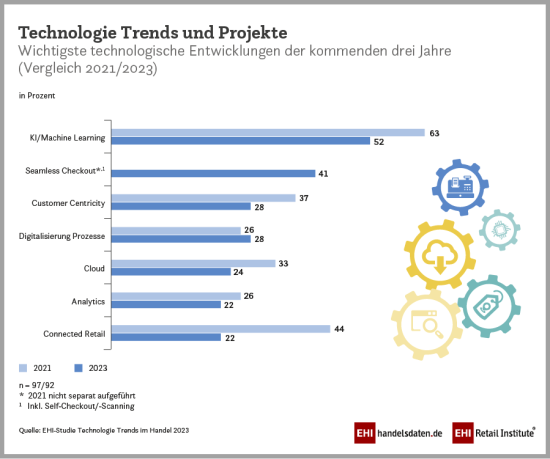 2021 sahen noch 44 Prozent der Entscheiderinnen und Entscheider in Connected Retail einen Trend, heute sind es nur 22 Prozent. Ein möglicher Grund dafür sei, erklären die Forscher, dass Omnichannel für viele Unternehmen mittlerweile zum Tagesgeschäft gehöre. Einen Rückgang von 33 Prozent auf 24 Prozent gibt es bei Cloud-Technologien. Die meisten Unternehmen haben inzwischen eine Cloud-Strategie definiert und sehen die Technologie daher nicht mehr als Zukunftstrend, betont das EHI.