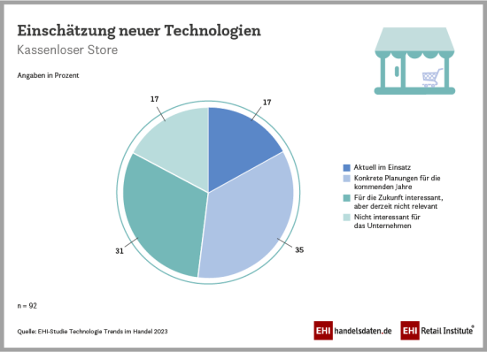 An zweiter Stelle folgt mit 41 Prozent der Seamless Checkout, der Self-Scanning und autonome Stores umfasst. 52 Prozent der befragten Handelsunternehmen haben kassenlose Stores bereits in Betrieb oder konkrete Pläne für die kommenden Jahre. Für den Rest der Befragten ist diese Technologie nicht oder noch nicht interessant.