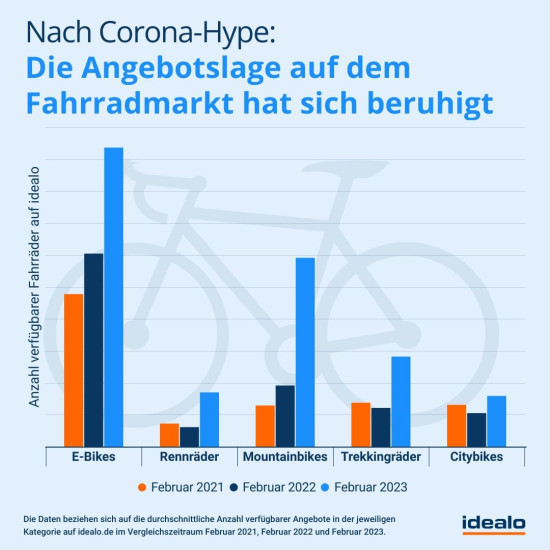 Hatte die Anzahl verfügbarer Fahrräder auf der Preisvergleichsplattform im Jahr 2021 ihren Tiefpunkt erreicht, ist das Angebot laut Idealo aktuell groß. Im Vergleich zum Februar 2021 waren im gleichen Monat 2023 über alle Fahrrad-Kategorien hinweg deutlich mehr Räder verfügbar: Im Bereich der E-Bikes etwa hat sich das Angebot in diesem Zeitraum fast verdoppelt. In der Kategorie Mountainbikes liegt der Zuwachs bei rund 360 Prozent. Bei Rennrädern betrug das Plus 135 Prozent, bei Trekkingrädern 105 Prozent und bei Citybikes 21 Prozent. Damit sei die Angebotslage sogar besser als vor Ausbruch der Pandemie, so die Plattform.