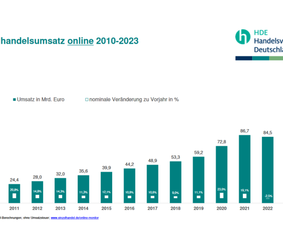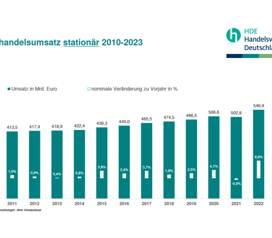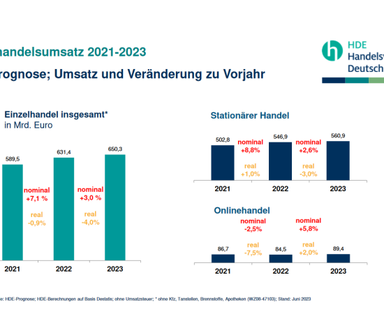 Angesichts der nach wie vor hohen Inflation passt HDE seine Umsatzprognose für den gesamten Einzelhandel an. Die neue Prognose geht im Vorjahresvergleich von einem nominalen Plus von 3,0 Prozent für 2023 aus. Das entspricht einem realen Minus von 4,0 Prozent. Bisher prognostizierte der HDE ein nominales Plus von 2 Prozent und ein reales Minus von 3 Prozent. Der stationäre Handel wird der neuen Prognose zufolge um nominal 2,6 Prozent auf 560,9 Mrd. Euro wachsen. Für den Online-Umsatz im Einzelhandel erwartet der Verband 2023 ein nominales Plus von 5,8 Prozent (real 2,0 Prozent) auf 89,4 Mrd. Euro.