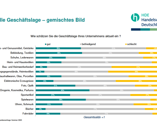 Die Hälfte der Händler (50 Prozent) von Bau- und Heimwerkerbedarf schätzt die aktuelle Geschäftslage als befriedigend ein, 9 Prozent als gut. Für 41 Prozent ist die derzeitige Lage schlecht. Das ist der zweithöchste Wert unter den 15 Einzelhandelsbranchen, die der Handelsverband Deutschland (HDE) für seine Konjunkturumfrage befragt hat. Nur im Segment Möbel, Einrichtungsgegenstände und Heimtextilien ist der Anteil der Händler, die die Lage als schlecht bewerten, mit 44 Prozent noch höher.