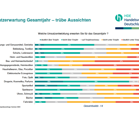 Dementsprechend sehen auch die Umsatzerwartungen für das Gesamtjahr in diesen Branchen am pessimistischsten aus. Bei Bau- und Heimwerkerbedarf erwarten 47 Prozent einen Jahresumsatz deutlich unter Vorjahr, 41 Prozent leicht unter Vorjahr, 9 Prozent leicht darüber und 3 Prozent deutlich darüber.