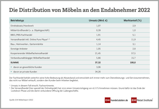 Vom Gesamtumsatz mit Möbeln entfielen 73,2 Prozent (27,31 Mrd. Euro) auf den stationären Möbelfachhandel. Mit einem Plus von 3,9 Prozent liegt der Möbelhandel unter dem Niveau des gesamten Einzelhandels, der laut Statistischem Bundesamt ein Plus von 7,8 Prozent verzeichnete, inflationsbereinigt aber 0,6 Prozent gegenüber 2021 verlor.