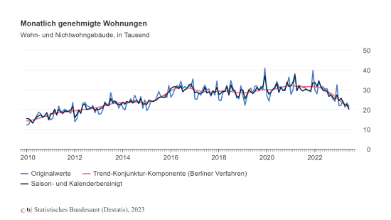 In Bezug auf das seit März 2023 laufende neue Programm der Bundesregierung „Wohnbauförderung für klimafreundlichen Neubau“ schreiben die Wiesbadener Statistiker, dass „noch kein eindeutiger Effekt dieser Maßnahmen auf die Genehmigungszahlen erkennbar“. sei. Wie sie hervorheben, ging die Zahl der Baugenehmigungen im Zeitraum März bis Juni 2023 im Vergleich zum Vorjahreszeitraum sogar etwas stärker zurück (Einfamilienhäuser -38,6 Prozent beziehungsweise -11.100, Zweifamilienhäuser -53,9 Prozent beziehungsweise -6.000 und Mehrfamilienhäuser -28,7 Prozent beziehungsweise -19.600) als im gesamten ersten Halbjahr 2023.