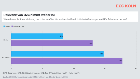 Die Kritikpunkte spiegeln sich auch bei einem Blick auf das Kaufverhalten wider: Während Spontankäufe (80 Prozent) und der Wunsch nach sofortiger Verfügbarkeit (69 Prozent) eher zu einem Kauf beim Händler führen, werden bei der Suche nach Informationen zur Herstellung (76 Prozent) und Ersatzteilen (70 Prozent) Hersteller präferiert. Mit Blick auf die Zukunft gewinnt das Thema Direct-to-Consumer (D2C) in der Branche noch stärker an Bedeutung. So schätzen 59 Prozent der bisherigen Nicht-D2C-Käufer und 71 Prozent der D2C-Käufer die Relevanz des Direktvertriebs in den kommenden fünf Jahren als (sehr) hoch ein.