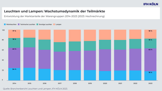 Die Marktanteile der vier Teilmärkte Wohnleuchten, technische Leuchten, sonstige Leuchten und Lampen haben sich demnach durch technische Neuerungen in den letzten Jahren unterschiedlich entwickelt. Dabei hatte vor allem der kleine Lampenmarkt einen verhältnismäßig großen Einfluss auf die Entwicklung des Gesamtumsatzes. Lag der Marktanteil bei der Etablierung von LED-Lampen 2017 bei fast 25 Prozent, so erreichte der Teilmarkt 2022 nur noch 18 Prozent und damit am wenigsten Marktanteile. Den größten Marktanteil machen beständig technische Leuchten aus.