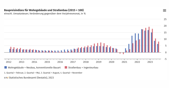 Auch die Neubaupreise für Bürogebäude stiegen, und zwar um 6,4 Prozent, für gewerbliche Betriebsgebäude stiegen sie um 5,7 Prozent.