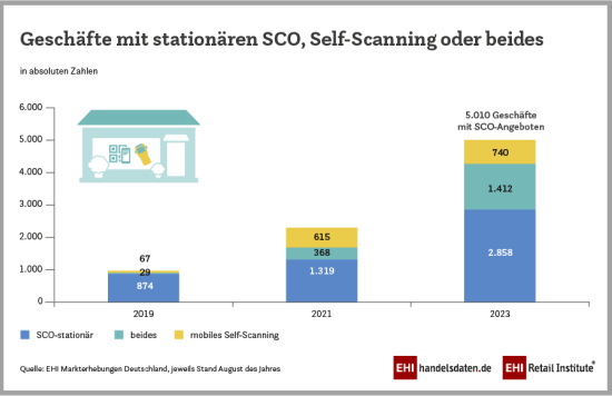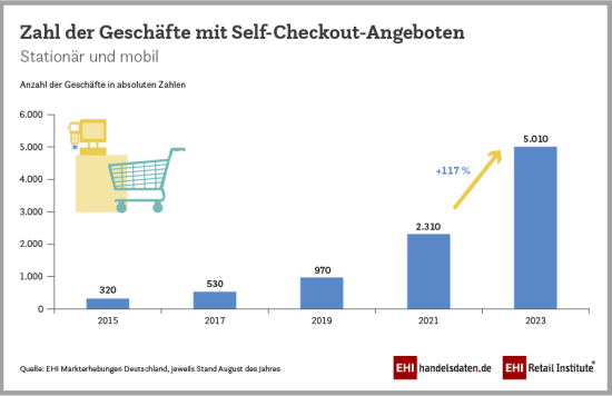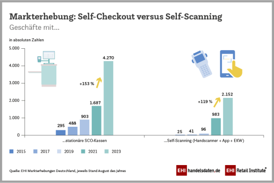 Die Marktanalyse des EHI mit Stand August 2023 umfasst insgesamt 63 Unternehmen und Unternehmensgruppen, die Self-Checkout-Möglichkeiten in unterschiedlicher Ausprägung im Einzelhandel anbieten. Darüber hinaus sind dem EHI nach eigener Aussage gut ein halbes Dutzend Unternehmen bekannt, die derzeit Tests durchführen oder erste Tests bis Ende 2023 planen.