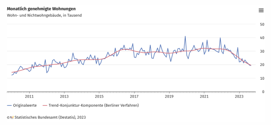 Der Bau von 19.300 Wohnungen wurde im September 2023 in Deutschland genehmigt. Wie das Statistische Bundesamt (Destatis) nach teilweise geschätzten Ergebnissen mitteilt, waren das 29,7 Prozent oder 8.200 Baugenehmigungen weniger als im September 2022. Von Januar bis September 2023 sank die Zahl der Baugenehmigungen für Wohnungen gegenüber dem Vorjahreszeitraum um 28,3 Prozent – dies entspricht einem Rückgang um 76.900 auf 195.100 Wohnungen. Zum Rückgang der Bauvorhaben dürften weiterhin vor allem hohe Baukosten und schlechte Finanzierungsbedingungen beigetragen haben, heißt es in der Pressemitteilung von Destatis. In den Ergebnissen sind sowohl die Baugenehmigungen für Wohnungen in neuen Gebäuden als auch für neue Wohnungen in bestehenden Gebäuden enthalten.