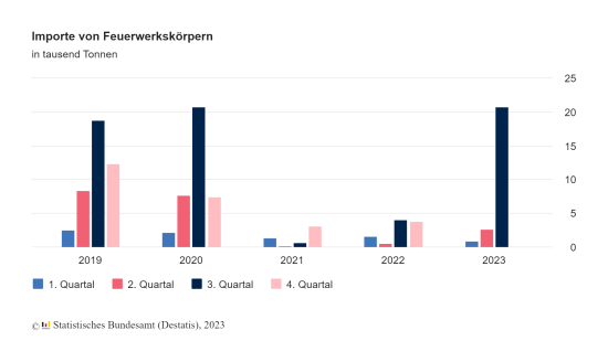 Das Vor-Corona-Niveau wurde jedoch noch nicht wieder erreicht: Im Vergleich zu der in den ersten drei Quartalen 2019 eingeführten Menge (29.800 t) sind die Importe von Feuerwerkskörper von Januar bis September 2023 um 18 Prozent zurückgegangen.