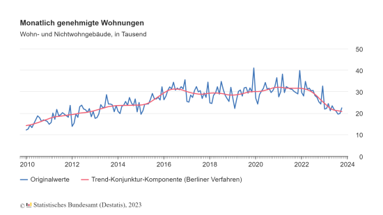 Rechnet man die Baugenehmigungen für Wohnungen in bestehenden Gebäuden hinzu, wurden im zurückliegenden Oktober bundesweit Genehmigungen für 22.500 Wohnungen erteilt. Das waren 11,5 Prozent oder 2.900 Baugenehmigungen weniger als im gleichen Monat des Vorjahres. Dieser im bisherigen Jahresverlauf schwächste Rückgang gegenüber einem Vorjahresmonat ist vor allem auf den Mehrfamilienhausbau zurückzuführen, so die Statistiker. Von Januar bis Oktober 2023 sank die Zahl der Baugenehmigungen für Wohnungen gegenüber dem Vorjahreszeitraum um 26,7 Prozent oder 79.300 auf 218.100 genehmigte Wohnungen.