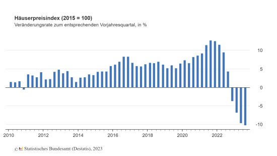 Die Preise für Wohnimmobilien in Deutschland sind laut Zahlen des Statistischen Bundesamtes (Destatis) im dritten Quartal 2023 um durchschnittlich 10,2 Prozent gegenüber dem Vorjahresquartal gesunken. Das war der stärkste Rückgang gegenüber einem Vorjahresquartal seit Beginn der Zeitreihe im Jahr 2000, so die Wiesbadener. In den ersten drei Monaten 2023 (-6,8 Prozent) und im zweiten Quartal 2023 (-9,6 Prozent) waren bereits die bis dahin stärksten Rückgänge verzeichnet worden. Im Vergleich zum zweiten Quartal 2023 sanken die Kaufpreise für Wohnimmobilien um 1,4 Prozent. Seinen bisherigen Höchststand erreichte der Wert im zweiten Quartal 2022, seitdem sind die Preise für Wohnimmobilien gegenüber dem jeweiligen Vorquartal rückläufig (erstes Quartal 2023: -2,9 Prozent zum Vorquartal; zweites Quartal 2023: -1,2 Prozent zum Vorquartal).