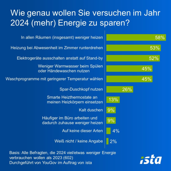 Um ihren Energieverbrauch zu senken, wollen 58 Prozent der Befragten in allen Räumen weniger heizen. 56 Prozent nehmen sich vor, die Heizung herunterzudrehen, wenn sie nicht im Raum sind. Smarte Thermostate wollen 13 Prozent installieren und 9 Prozent fahren ins Büro, um zuhause nicht heizen zu müssen. Auch das vollständige Abschalten von Elektrogeräten (52 Prozent) und die Auswahl von Waschprogrammen mit niedrigerer Temperatur (45 Prozent) sind beliebte Energiesparmethoden. Die kalte Dusche ist bei 9 Prozent das Mittel der Wahl. Einen Sparduschkopf wollen 26 Prozent der Befragten nutzen.