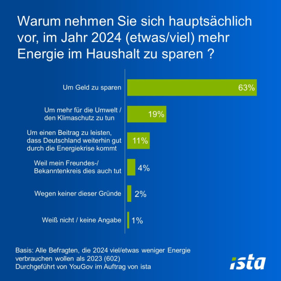 Während als Motivation fürs Energiesparen im kommenden Jahr 19 Prozent den Umwelt- und Klimaschutz nennen – im Vorjahr waren es 11 Prozent –, bleibt die Hauptmotivation für 63 Prozent der Deutschen der Kostenaspekt.