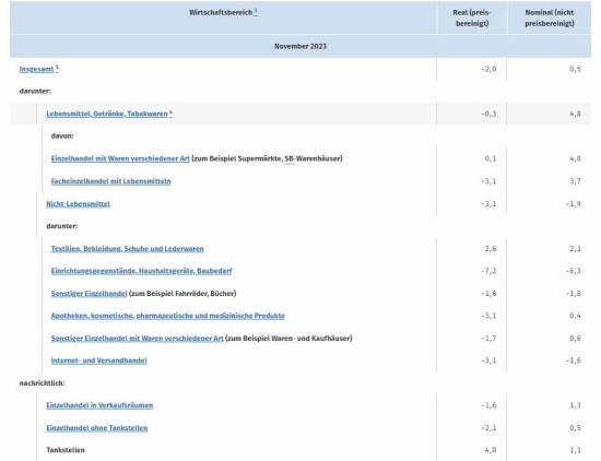 In den vergangenen Jahren hat sich ein Teil des Weihnachtsgeschäfts durch Sonderaktionen wie den Black Friday oder den Cyber Monday in den November vorverlagert. Im November 2023 setzten die Einzelhandelsunternehmen nach vorläufigen Ergebnissen kalender- und saisonbereinigt allerdings real 2,5 Prozent und nominal 2,6 Prozent weniger um als im Oktober 2023, in dem das größte reale Umsatzplus seit über einem Jahr erzielt worden war (revidiert +1,3 Prozent zum Vormonat und +0,2 Prozent zum Vorjahresmonat). Im Vorjahresvergleich sank der reale Umsatz im November 2023 gegenüber November 2022 um 2,4 Prozent, nominal stieg er allerdings um 0,1 Prozent.