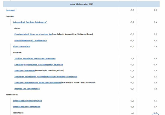 Der reale Umsatz im gesamten Einzelhandel mit Nicht-Lebensmitteln sank um 3,6 Prozent gegenüber dem Vormonat und um 3,1 Prozent gegenüber dem Vorjahresmonat, so die Wiesbadener weiter. Im Internet- und Versandhandel ging der reale Umsatz im November um 2,8 Prozent zum Vormonat zurück und lag damit um 3,5 Prozent unter dem Niveau des Vorjahresmonats.