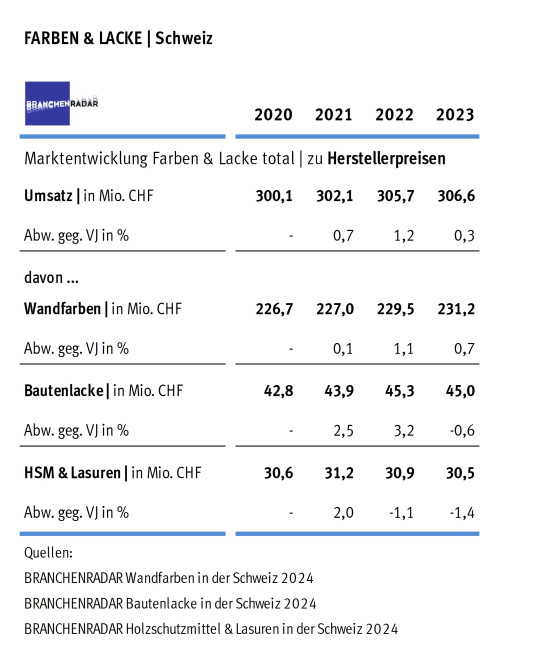 Laut dem Branchenradar Farben und Lacke in der Schweiz stagnierte der Herstellerumsatz insgesamt bei rund 307 Mio. Schweizer Franken (ca. 316,5 Mio. Euro). Die stabilen Erlöse seien jedoch ausschließlich auf steigende Verkaufspreise zurückzuführen, schreiben die Autoren. Die Nachfrage sank in allen Warengruppen.