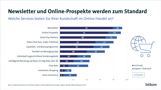 Bei ihren digitalen Services setzen Online-Händler besonders auf Information und schnelle Lieferung. Das ist ein Ergebnis einer Befragung unter 503 Handelsunternehmen in Deutschland im Auftrag des Digitalverbands Bitkom. 79 Prozent bieten demnach Newsletter an, 14 Prozent planen oder diskutieren es. Online-Prospekte stellen 72 Prozent zur Verfügung, 19 Prozent planen oder diskutieren den Einsatz. 68 Prozent bieten eine Lieferung am selben Tag. 17 Prozent setzen sich damit auseinander, dies zukünftig anzubieten.