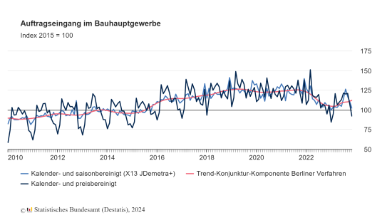 Der reale (preisbereinigte) Auftragseingang im Bauhauptgewerbe ist nach Angaben des Statistischen Bundesamtes (Destatis) im November 2023 gegenüber dem Vormonat kalender- und saisonbereinigt um 7,4 Prozent gesunken. Während der Auftragseingang im Tiefbau um 15,1 Prozent abnahm, stieg er im Hochbau um 1,6 Prozent. Dabei ging der Wohnungsbau um 6,8 Prozent zurück und der Hochbau ohne Wohnungsbau stieg um 7,2 Prozent gegenüber Oktober 2023.