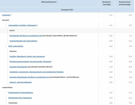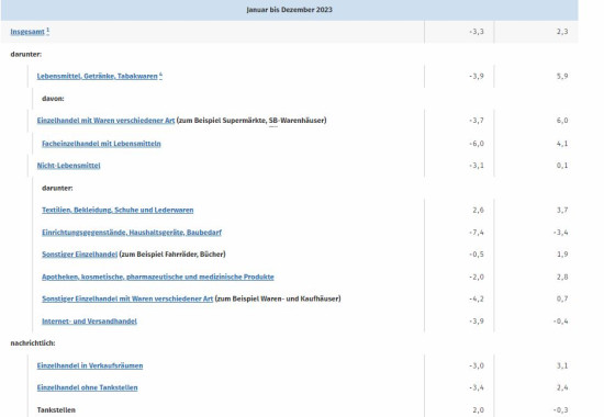 Im Weihnachtsgeschäft des Dezembers 2023 setzten die Einzelhandelsunternehmen nach vorläufigen Ergebnissen real 1,7 Prozent weniger um als im Dezember 2022. Nominal stieg der Umsatz dagegen um 0,8 Prozent. Im Vergleich zum November 2023 ging der Umsatz kalender- und saisonbereinigt real 1,6 Prozent und nominal 1,2 Prozent zurück. Im Einzelhandel mit Nicht-Lebensmitteln waren die Umsätze im Dezember sowohl im Vormonatsvergleich (real -1,6 Prozent und nominal -1,3 Prozent) als auch im Vorjahresvergleich (real -2,5 Prozent und nominal -1,2 Prozent) rückläufig.