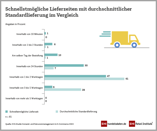 Für besonders schnelle Lieferzeiten nehmen die Händler teilweise einen Aufpreis. Als schnellstmögliche Lieferzeit gibt ein Unternehmen an, innerhalb von zehn Minuten zu liefern, 6 Prozent innerhalb von ein bis zwei Stunden und 30 Prozent innerhalb von 24 Stunden. 10 Prozent liefern noch am Tag der Bestellung. 47 Prozent können innerhalb von ein bis zwei Werktagen an die Kundschaft ausliefern. Bei 6 Prozent der Befragten handelt es sich bei der schnellstmöglichen Liefergeschwindigkeit um eine Versendung innerhalb von drei bis fünf Werktagen.
