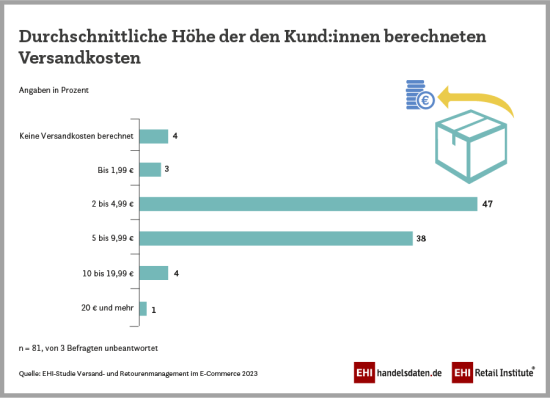 Der Versand ist im Onlinehandel der entscheidende Kostentreiber. Das sagen 78 Prozent der befragten Händler der EHI-Studie „Versand- und Retourenmanagement im E-Commerce 2023“. Nur 4 Prozent berechnen keine Versandkosten. Beim Großteil (85 Prozent) der Studienteilnehmer liegen die Versandkosten zwischen 2 und 10 Euro. Die durchschnittlichen Logistikkosten pro Artikel betragen bei 33 Prozent der Befragten bis zu 5 Euro, bei 41 Prozent bis zu 25 Euro und bei 8 Prozent über 25 Euro, Retouren nicht mitgerechnet.