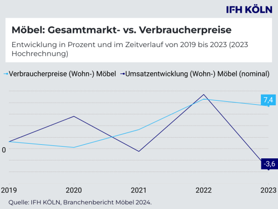 Für 2024 und 2025 prognostizieren die Marktexperten erneut ein herausforderndes Jahr mit einem nominalen Umsatzminus von 2,6 Prozent. Die negativen Konjunkturaussichten werden auch den Möbelhandel beeinflussen, so das IFH weiter. Ein leichtes Marktwachstum wird erst im Jahr 2026 erwartet. „Die privaten Haushalte sind verunsichert. Die Ausgaben für Möbel werden aufgeschoben oder man greift auf Secondhandware zurück. Diese Tendenz wird uns auch 2024 weiter begleiten. Erschwerend kommt hinzu, dass auch die Baubranche krisengebeutelt ist. Aber: Die Inflation beruhigt sich“, sagt Christoph Lamsfuß, Senior Consultant am IFH.