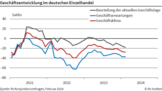 Das Geschäftsklima im Einzelhandel hat sich im Februar den dritten Monat in Folge verschlechtert, wie aus aktuellen Umfragen des Ifo-Instituts hervorgeht. „Das konjunkturelle Umfeld bleibt für den Einzelhandel weiter sehr herausfordernd“, meint dazu ifo-Experte Patrick Höppner. „Die Verbraucherinnen und Verbraucher halten sich beim Einkaufen zurück, das belastet die Geschäfte der Einzelhändler.“