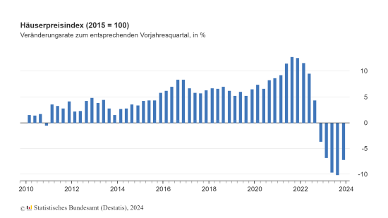 In städtischen Kreisen war der Preisrückgang für Ein- und Zweifamilienhäuser mit 11,0 Prozent zum Vorjahresquartal besonders ausgeprägt (-2,7 Prozent zum dritten Quartal 2023). Für Eigentumswohnungen zahlte man in diesen Regionen im Durchschnitt 7,1 Prozent weniger (-1,9 Prozent zum dritten Quartal 2023). In dünn besiedelten ländlichen Kreisen waren Ein- und Zweifamilienhäuser 6,9 Prozent und Eigentumswohnungen 2,8 Prozent günstiger als im vierten Quartal 2022. Im Vergleich zum Vorquartal sanken die Preise in diesen Regionen um 2,1 Prozent für Ein- und Zweifamilienhäuser sowie um 3,1 Prozent für Eigentumswohnungen.