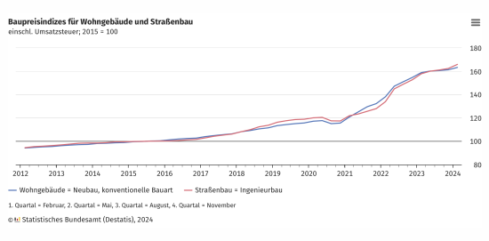 Die Preise für den Neubau konventionell gefertigter Wohngebäude in Deutschland sind im Februar 2024 um 2,8 Prozent gegenüber Februar 2023 gestiegen. Im November 2023, dem vorherigen Berichtsmonat der Statistik, waren die Preise im Vorjahresvergleich um 4,3 Prozent gestiegen. Wie das Statistische Bundesamt (Destatis) weiter mitteilt, erhöhten sich die Baupreise im Februar 2024 gegenüber November 2023 um 1,2 Prozent. Alle Preisangaben beziehen sich auf Bauleistungen am Bauwerk einschließlich Mehrwertsteuer.