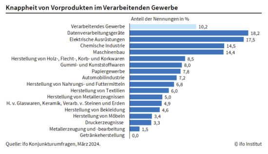 „Der Tarifstreit bei der Deutschen Bahn wurde beigelegt und die Logistikbranche hat sich an die Verhältnisse im Roten Meer angepasst. Deshalb gibt es momentan weniger Probleme“, fuhr Wohlrabe fort. In keiner Branche übersteigt der Anteil der von Engpässen betroffenen Firmen demnach 20 Prozent. Am stärksten betroffen sind die Hersteller von Datenverarbeitungsgeräten mit 18,2 Prozent, dicht gefolgt von den Produzenten elektrischer Ausrüstungen (17,5 Prozent), dem Maschinenbau (14,4 Prozent) und der Chemischen Industrie (14,5 Prozent).