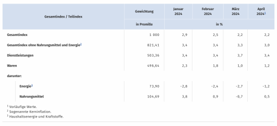 Die Inflationsrate in Deutschland wird im April 2024 voraussichtlich 2,2 Prozent betragen, berichtet das Statistische Bundesamt (Destatis). Gemessen wird sie als Veränderung des Verbraucherpreisindex (VPI) zum Vorjahresmonat. Wie Destatis nach bisher vorliegenden Ergebnissen weiter mitteilt, steigen die Verbraucherpreise gegenüber März 2024 voraussichtlich um 0,5 Prozent. Die Inflationsrate ohne Nahrungsmittel und Energie, oftmals auch als Kerninflation bezeichnet, beträgt demnach voraussichtlich 3,0 Prozent.