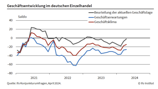 Das Geschäftsklima im Einzelhandel hat sich im April weiter aufgehellt, wie aus den aktuellen Umfragen des Ifo-Instituts hervorgeht. Der Indikator stieg auf minus 14,5 Punkte, nach minus 17,5 Punkten im März. Dabei habe sich die Bewertung der aktuellen Geschäftslage deutlich verbessert. Auch die Geschäftserwartungen der Einzelhändler seien etwas optimistischer geworden, blieben aber noch überwiegend verhalten. „Die konsumnahen Branchen werden 2024 voraussichtlich eine Stütze für die Gesamtwirtschaft sein“, machte Ifo-Experte Patrick Höppner Hoffnung.