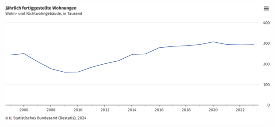 Im Jahr 2023 wurden in Deutschland 294.400 Wohnungen gebaut. Wie das Statistische Bundesamt (Destatis) mitteilt, waren das 0,3 Prozent oder 900 Wohnungen weniger als im Vorjahr. Damit hat sich die Zahl der jährlich fertiggestellten Wohnungen seit dem Jahr 2021 kaum verändert (2021: 293.400; 2022: 295.300). Zuvor war die Zahl der Wohnungen von 159.800 im Jahr 2010 bis auf 306.400 Wohnungen im Jahr 2020 gestiegen.