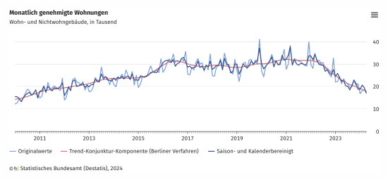 Dabei ging die Zahl der Baugenehmigungen für Einfamilienhäuser um 32,5 Prozent auf 12.300 zurück. Bei den Zweifamilienhäusern sank die Zahl genehmigter Wohnungen um 18,3 Prozent auf 4.400. Auch bei der zahlenmäßig stärksten Gebäudeart, den Mehrfamilienhäusern, verringerte sich die Zahl der genehmigten Wohnungen deutlich um 20,2 Prozent auf 38.500 Wohnungen.