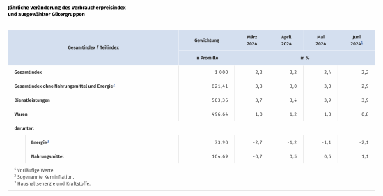 Die Inflationsrate in Deutschland wird im Juni 2024 voraussichtlich 2,2 Prozent betragen. Damit ist sie nach 2,4 Prozent im Mai wieder auf den Wert von April und März zurückgegangen. Gemessen wird sie als Veränderung des Verbraucherpreisindex zum Vorjahresmonat. Wie das Statistische Bundesamt (Destatis) nach bisher vorliegenden Ergebnissen weiter mitteilt, steigen die Verbraucherpreise gegenüber Mai 2024 voraussichtlich um 0,1 Prozent. Die Inflationsrate ohne Nahrungsmittel und Energie, oftmals auch als Kerninflation bezeichnet, beträgt voraussichtlich 2,9 Prozent.