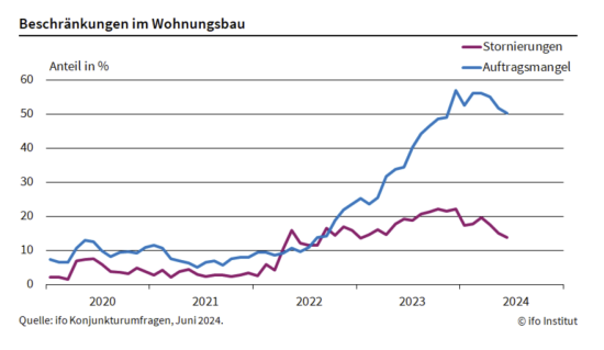 Der Auftragsmangel im Wohnungsbau ist leicht zurückgegangen. Im Juni berichteten 50,2 Prozent der Unternehmen davon, im Vergleich zu 51,7 Prozent im Mai, so eine Pressemitteilung des Ifo-Instituts zu seiner neuesten Konjunkturumfrage. „Der Mangel an neuen Aufträgen ist weiterhin ein großes Problem: Häuslebauer sind zurückhaltend, auch weil die Leitzinssenkung der Europäischen Zentralbank vorerst nur ein erster Schritt ist“, erklärte Klaus Wohlrabe, Leiter der Ifo-Umfragen. Bei den Finanzierungskosten habe sich noch nicht viel getan und das spiegele sich auch in der Entwicklung der Baugenehmigungen wider.