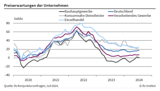 Im Verarbeitenden Gewerbe seien die Preiserwartungen auf 7,3 Punkte gestiegen, nach 6,6 Punkten im Juni. In den unternehmensnahen Dienstleistungsbereichen (inklusive Großhandel) und im Bauhauptgewerbe wollten hingegen weniger Unternehmen ihre Preise anheben: In diesen Bereichen fiel der Indikator laut Ifo auf 20,6 beziehungsweise 0,9 Punkte, nach 22,5 bzw. 2,1 Punkten im Juni.