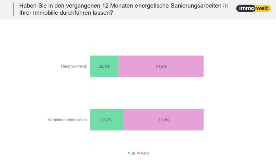 Viele Immobilieneigentümer haben in jüngster Zeit Sanierungsarbeiten durchführen lassen. Das zeigt eine Umfrage des Onlineportals Immowelt. Bei rund einem Viertel der Befragten standen demnach innerhalb der vergangenen zwölf Monate solche Arbeiten am Hauptwohnsitz an. Bei von privaten Eigentümern vermieteten Immobilien stieg die Quote auf 29,7 Prozent.