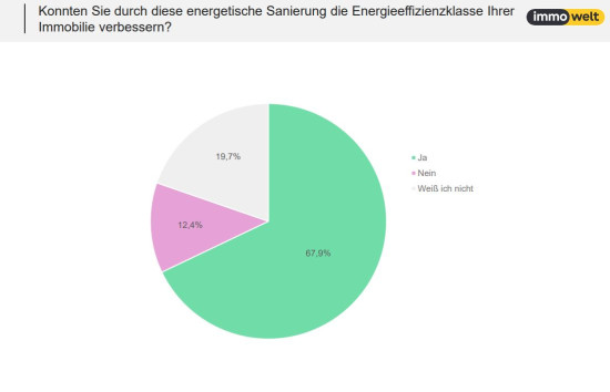 67,9 Prozent der befragten Eigentümer, die innerhalb der vergangenen zwölf Monate Renovierungsarbeiten durchführen ließen, haben nun eine höhere Klasse im Energieausweis stehen. 19,7 Prozent gaben an, dass sie nicht wüssten, ob sich die Energieeffizienzstufe verbessert hat.