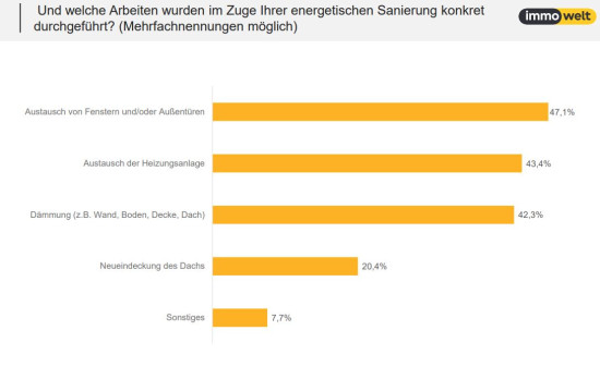 Nahezu jeder zweite Eigentümer, der jüngst Sanierungsarbeiten hat machen lassen, tauschte Fenster oder Außentüren. 43,4 Prozent entschieden sich für eine neue Heizanlage und 42,3 Prozent für eine neue Dämmung. Ein gänzlich neues Dach haben 20,4 Prozent decken lassen. 47,8 Prozent haben mithilfe eines Profis, etwa eines Energieberaters, festgelegt, welche Arbeiten erledigt werden sollen.