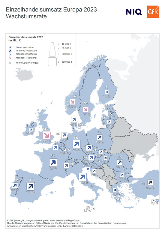 Einzelhandelsumsatz: Vergleichbar zur Kaufkraft stieg der Einzelhandelsumsatz in den EU-Staaten um 5,5 Prozent an. Dieses nominale Umsatzplus relativiert sich laut GfK jedoch angesichts hoher Verbraucherpreise. Die höchsten Wachstumsraten innerhalb der EU waren in osteuropäischen Staaten wie Bulgarien (+18 Prozent), Rumänien (+14 Prozent) und Kroatien zu beobachten (+14 Prozent), wobei auch größere Märkte wie Spanien und Polen Wachstumsraten von über 12 Prozent verzeichneten.