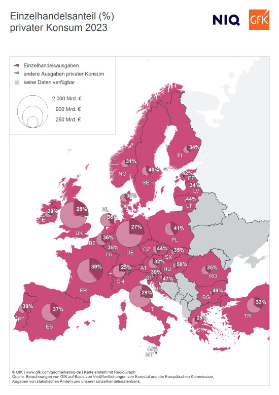 In vielen osteuropäischen Ländern fließt fast jeder zweite Euro in den Einzelhandel, allen voran in Ungarn (50 Prozent), Bulgarien (49 Prozent) oder Kroatien (47 Prozent). Den letzten Platz belegt Deutschland, wo knapp 27 Prozent der Konsumausgaben im Einzelhandel ausgegeben werden.