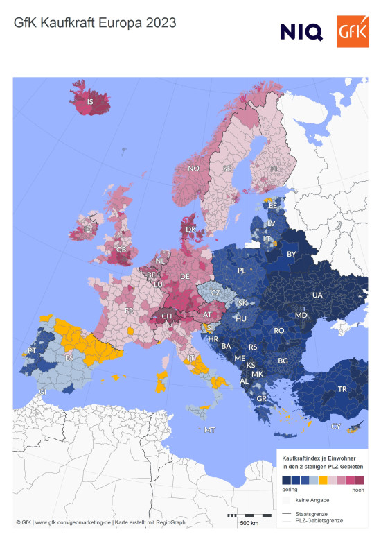 Kaufkraft: Nachdem die Kaufkraft der EU-Bürger bereits 2022 um 7 Prozent angestiegen ist, stieg das verfügbare Nettoeinkommen auch 2023 wieder deutlich an. EU-weit betrug die Pro-Kopf-Kaufkraft durchschnittlich 19.786 Euro, was einem Anstieg von nominal 5,5 Prozent entspricht. Insgesamt standen den Einwohnern der 27 Mitgliedsstaaten rund 8,9 Bio. Euro an Kaufkraft zur Verfügung.