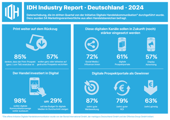 Der Glaube an die Zukunft der Printwerbung, insbesondere des Print-Prospekts, schwindet weiter. Diesen Schluss jedenfalls zieht die Initiative Digitale Handelskommunikation aus ihrer Befragung von 50 Marketingverantwortlichen aus allen Handelsbereichen zu Trends und Herausforderungen im Handelsmarketing befragt. Herausgegeben wird der IDH Industry Report 2024 von Bonial, Marktguru und Offerista. Er ist keine statistisch repräsentative Umfrage, will aber Branchenvertretern und Medien ein aktuelles Stimmungsbild des Marktes geben. Alle drei Auftraggeber sind im Bereich der digitalen Angebotskommunikation tätig.