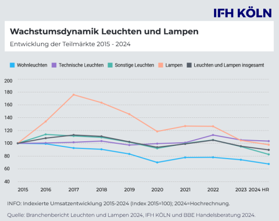 Die Branche Leuchten und Lampen spiegelt in ihrer Dynamik die Krisen der vergangenen Jahre wider. Zu diesem Ergebnis kommt ein neuer Branchenbericht des IFH Köln und der BBE-Handelsberatung. Die Pandemie hatte demnach 2020 die Nachfrage nach Leuchten und Lampen stark ausgebremst – vor allem durch weniger Nachfrage bei Wohnleuchten. Durch Nachholeffekte folgte 2021 und 2022 eine deutliche Erholung, die 2023 mit einem Umsatzminus von 9,1 Prozent wieder stark zurückfiel.