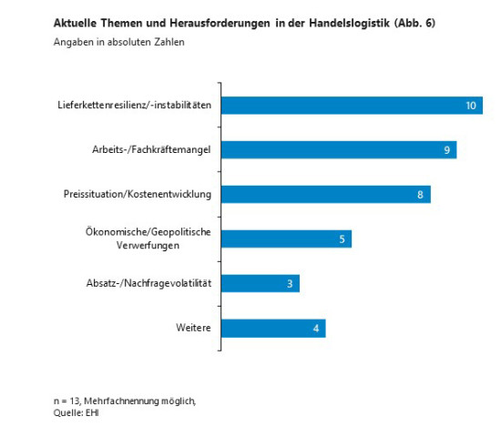 Als größte Herausforderung in der Handelslogistik nennen drei Viertel der Befragten instabile Lieferketten – ausgelöst durch den Krieg in der Ukraine. Nachdem sich die Situation inzwischen deutlich entspannt hat, liegt der Fokus der Händler nun auf der Stärkung der Lieferketten. Auch der Fachkräftemangel spielt für viele Unternehmen eine große Rolle – neun von 13 Befragten nennen die Personalsuche als Herausforderung. Acht Händler haben mit der Kostenentwicklung und den damit verbundenen Preissteigerungen zu kämpfen.
