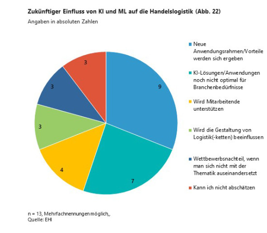 Elf von 13 Befragten schätzen die zukünftige Bedeutung von KI für eine moderne Handelslogistik als hoch ein. In Bezug auf den zukünftigen Einfluss gehen neun Befragte von Vorteilen aus, sieben sind jedoch der Meinung, dass KI-Lösungen noch nicht optimal an die Bedürfnisse der Branche angepasst sind. Mit sechs Unternehmen setzt knapp die Hälfte bereits KI ein, drei Unternehmen nutzen KI teilweise und bei vier weiteren ist der Einsatz in Planung.